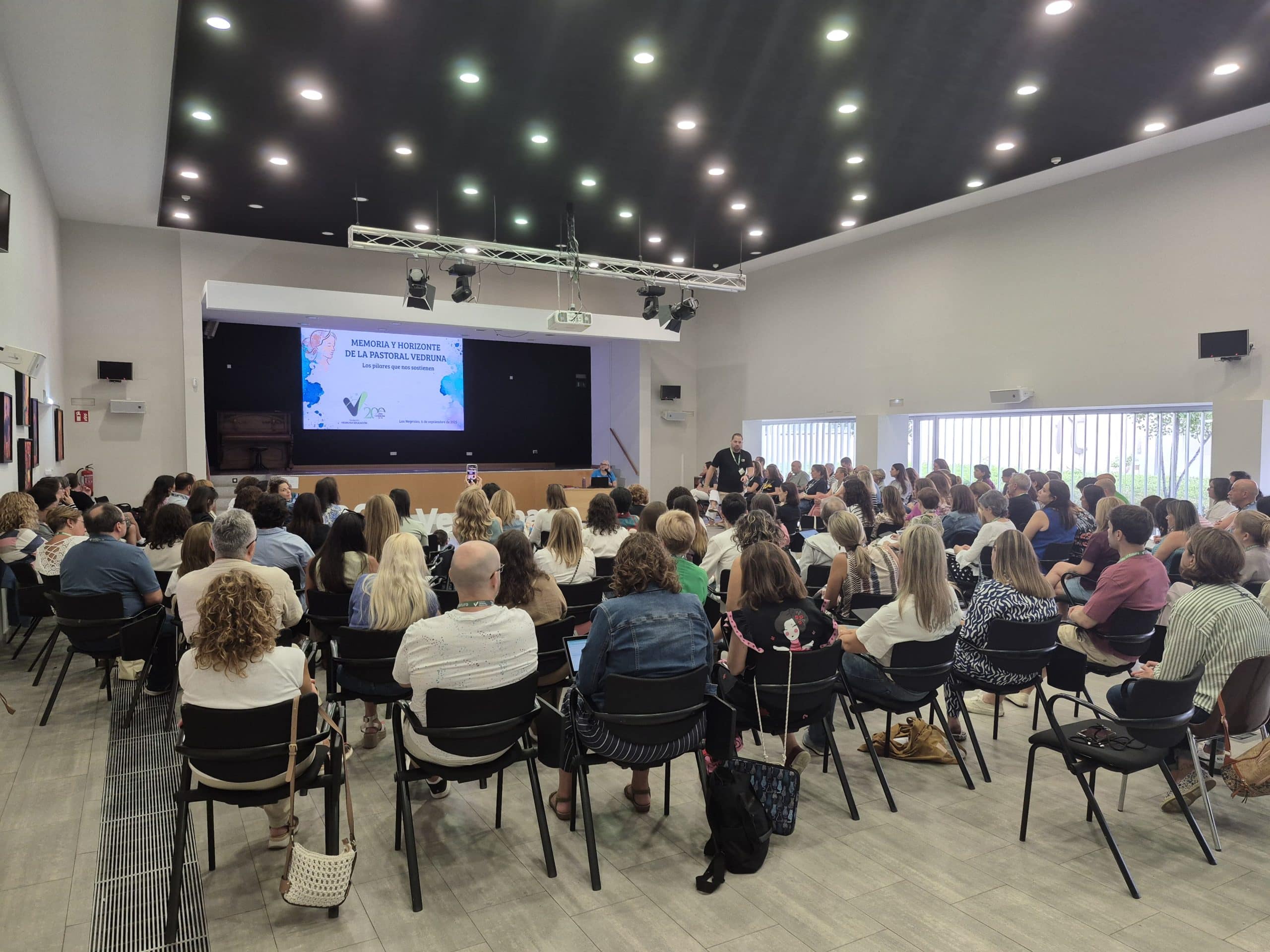 Nos reunimos más de 130 personas, entre ellas once hermanas: los equipos de pastoral de los 33 colegios Vedruna, la Pastoral Juvenil Vedruna, el Colegio Mayor, la Hna. Dolors García del Patronato de la FVE y David de Frutos coordinador del Equipo de Gestión.