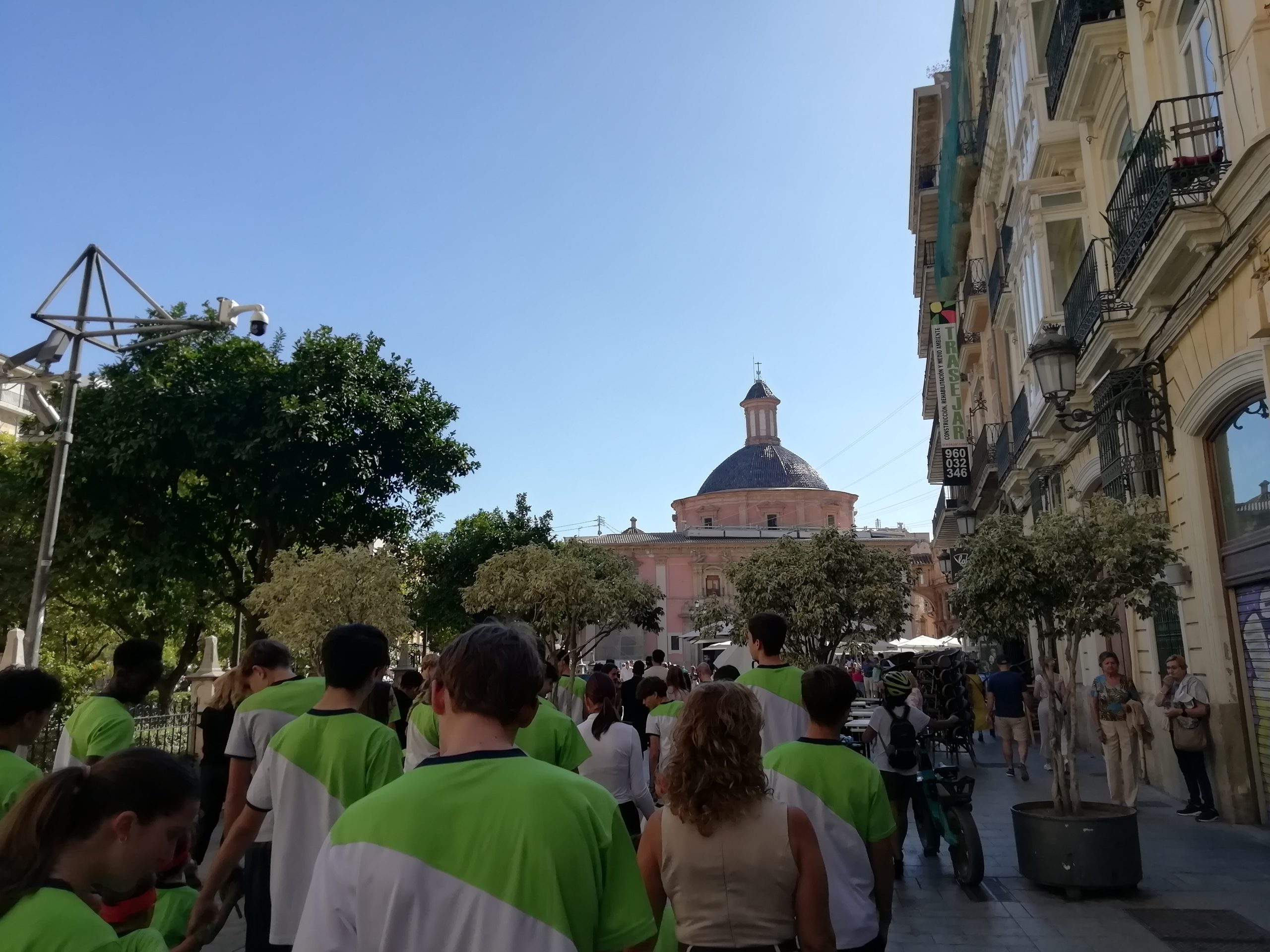 Posteriormente, a mitad mañana, todo el colegio realizó un pasacalles acompañado por una batucada por el entorno de nuestro colegio que tuvo como colofón la entrega de un ramo de flores a la Virgen de los Desamparados, nuestra patrona, en la Basílica de la Virgen.