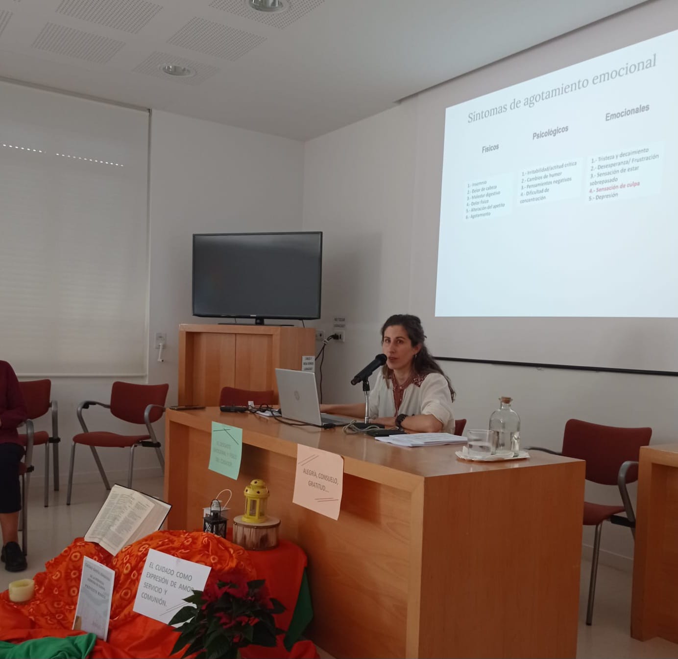 Nos acompañó Ana Aizpun, psicóloga clínica y psicoterapeuta, quien comenzó a exponer el tema, centrado sobre todo en la necesidad que tiene toda persona cuidadora, de cuidarse. Porque cuando una persona sostiene a otra, necesita ser sostenida. Se puede afirmar que a nosotras nos sostiene Dios, pero…no del todo, porque como seres humanos necesitamos, descansar, recibir, dejarnos cuidar.
