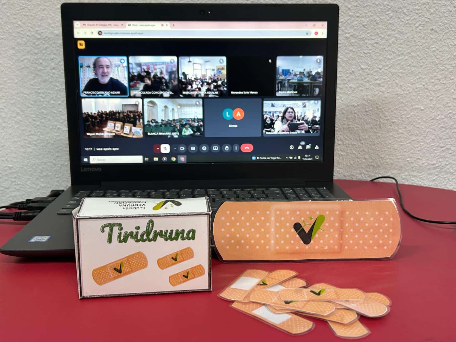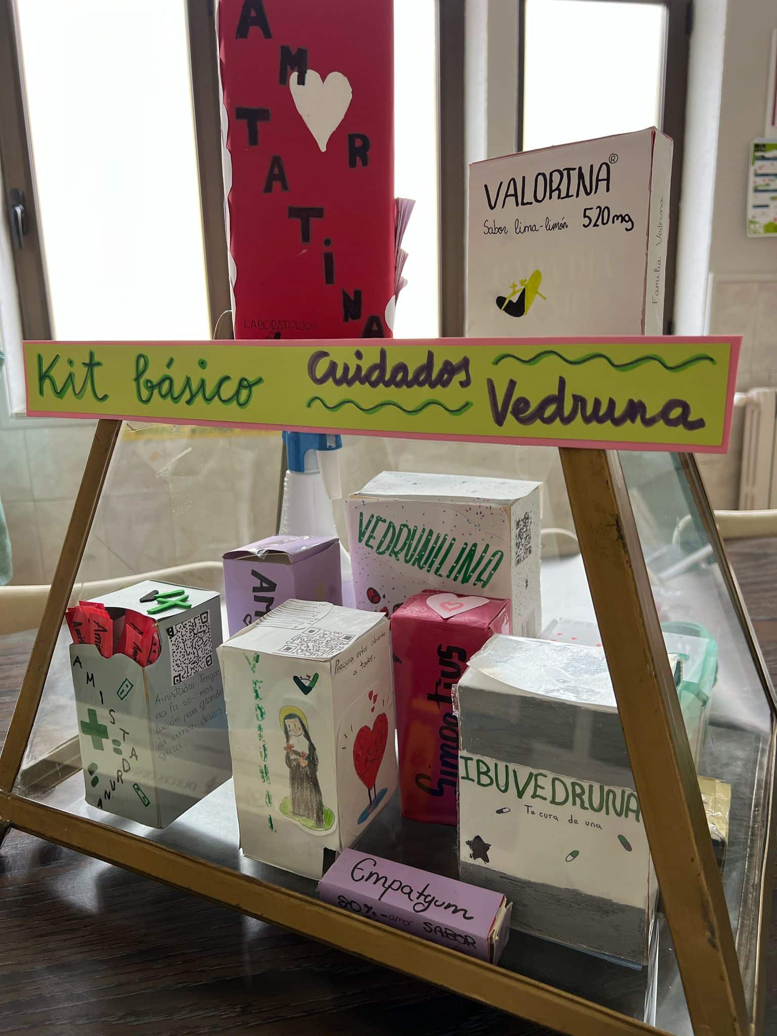 Los alumnos con sus tutores y educadores han realizado un trabajo previo, que compartieron con todos en este encuentro: un kit básico de cuidados Vedruna, con las características que entre todos hemos decidido que son fundamentales para el cuidado vedruna y que nosotros vamos a asumir como compromiso de clase, durante el resto del curso. Presentaremos una o dos características de nuestro kit con el nombre del medicamento que hemos creado.