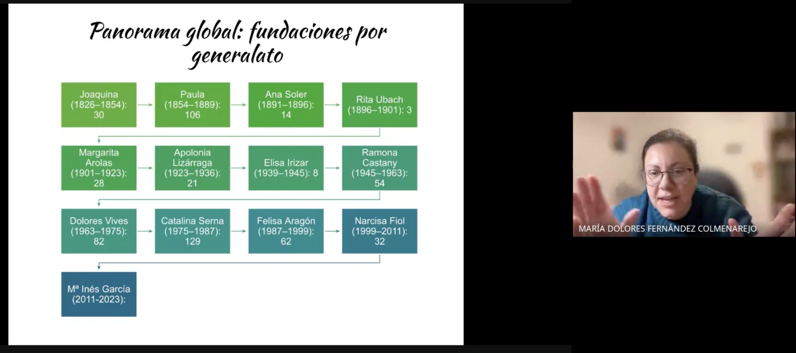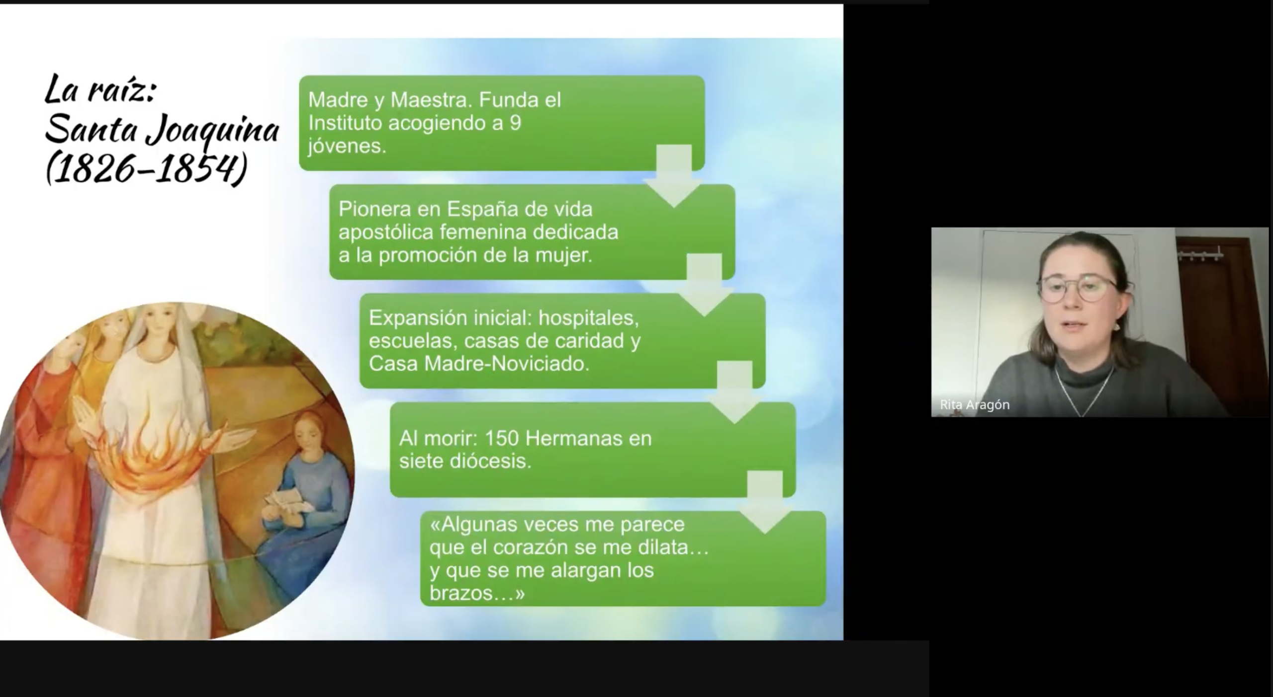 Esta vez es la propia general quien se presenta por medio de un vídeo que se proyecta en el webinar: “Mi misión es acompañar, animar, conocer los lugares donde está el carisma Vedruna y estar atenta a la unidad de la familia”, afirma. “También represento a la familia ante las instituciones eclesiales y civiles cuando hace falta”.