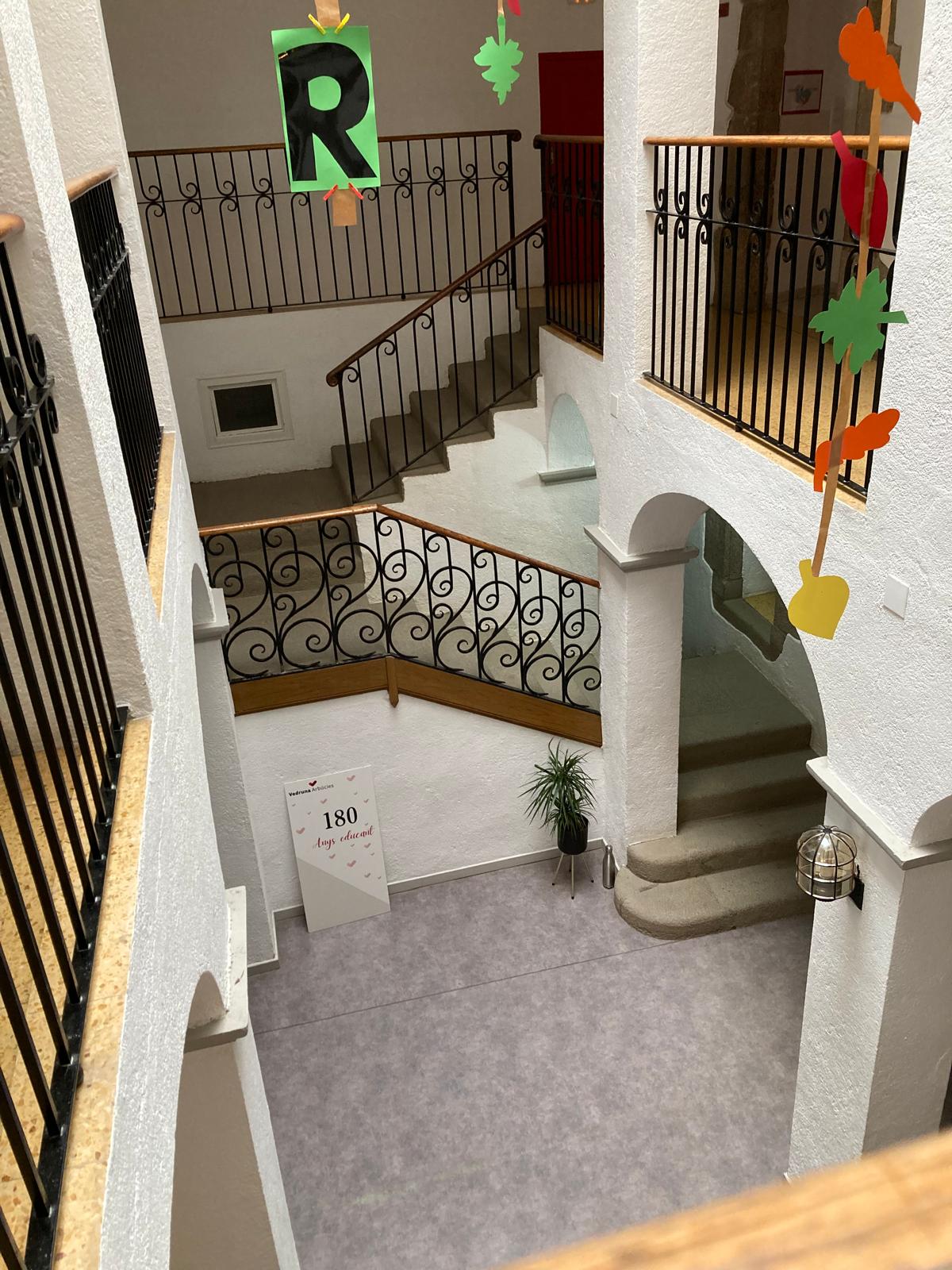 El jueves 9 de octubre, unes treinta hermanas fuimos a Arbúcies (provincia de Girona) para celebrar los 180 años de la fundación por Joaquina de Vedruna. Al llegar nos recibió el equipo directivo de la escuela. La directora, Gloria Bohils, nos hizo una buena presentación del pasado y, sobre todo, del presente. Estábamos instaladas en el espacio de la entrada delante de la escalera que utilizaba santa Joaquina. Una inscripción en un póster tal como se ve en la foto, da constancia de la efeméride. No podíamos dejar de pensar en las veces que Joaquina subiría y bajaría estos mismos peldaños; puesto que ya sabemos que, cuando estuviera la comunidad instalada, las visitaría con la frecuencia que le fuera posible.